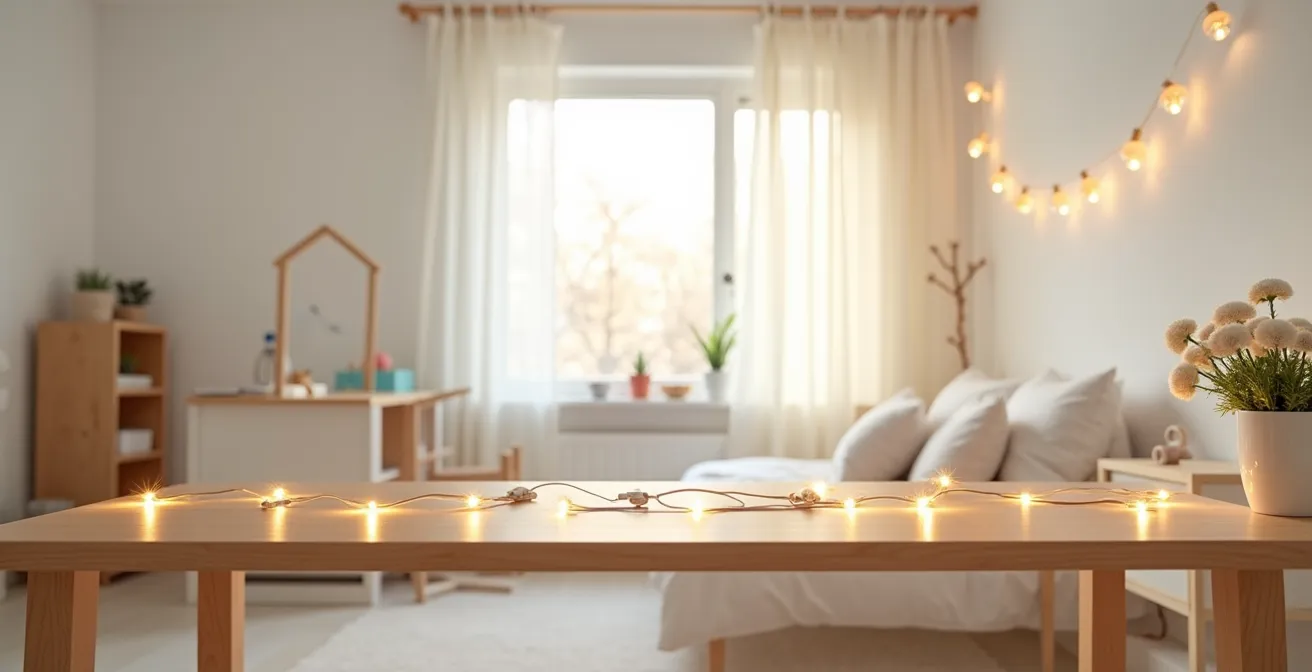 Mais pour aller plus loin, il faut penser l’éclairage comme un écosystème. Plutôt que d’avoir un seul plafonnier surpuissant, il est plus judicieux de multiplier les sources lumineuses de faible puissance et de les dédier à des usages spécifiques. C’est le principe du « zonage lumineux ». Un éclairage de bureau doit être neutre et puissant (environ 4000K, IRC > 90), tandis qu’une lampe de chevet doit être chaude et douce (< 2700K). Votre guirlande DIY, elle, s'occupera de l'éclairage d'ambiance.